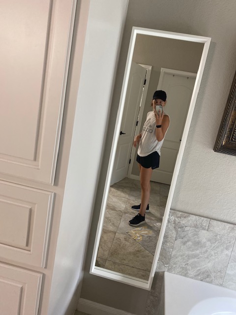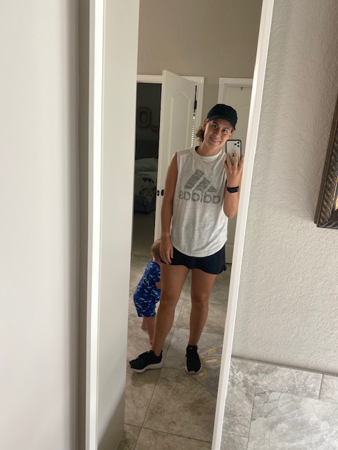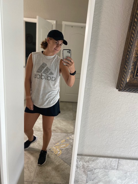 I grew up playing tennis, and I wore tennis skirts A LOT. So wearing them is a go-to when I am running errands, or when I want to be one step up from just shorts and a t-shirt. It was a busy day, so I only had time for a quick bathroom selfie. I also was very lucky that two little boys weren’t a blur in the background.